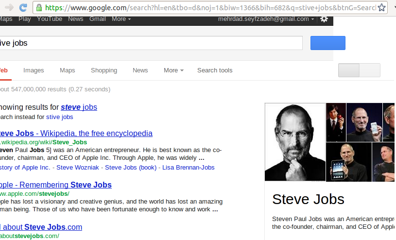 ولی چرا باید این تفکر پیش بیاد که گوگل پا در کفش سایت های دیگر کرده. مثلا کاربری میخواد در مورد استیو جابز اطلاعات کسب کنه. البته کاملا هم نمیدونه به انگلیسی استیو جابز رو چطوری مینویسن. و ببینیم نتیجه گوگل رو: