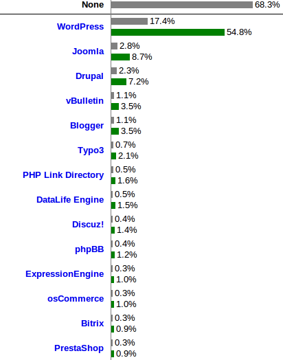 اما انگار آخرین آمارها طبق سایت معتبر w3techs.com برگ برنده دست وردپرس است. در تصویر زیر میزان استفاده از سیستمهای مدیریت محتوا را در اینترنت مشاهده می کنید که از این آدرس گرفته شده. نوار خاکستری میزان استفاده از یک سیستم در کل اینترنت و نوار سبز رنگ میزان سهم آن در بین دیگر سیستم های مدیریت محتوا را نشان میدهد.